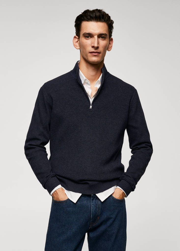 Tissu de coton et polyester mélangés. Maille fine. Structure à mini-carreaux. Coupe regular. Col montant à fermeture Éclair. Manches longues avec poignets élastiques. Bas droit à bords côtelés