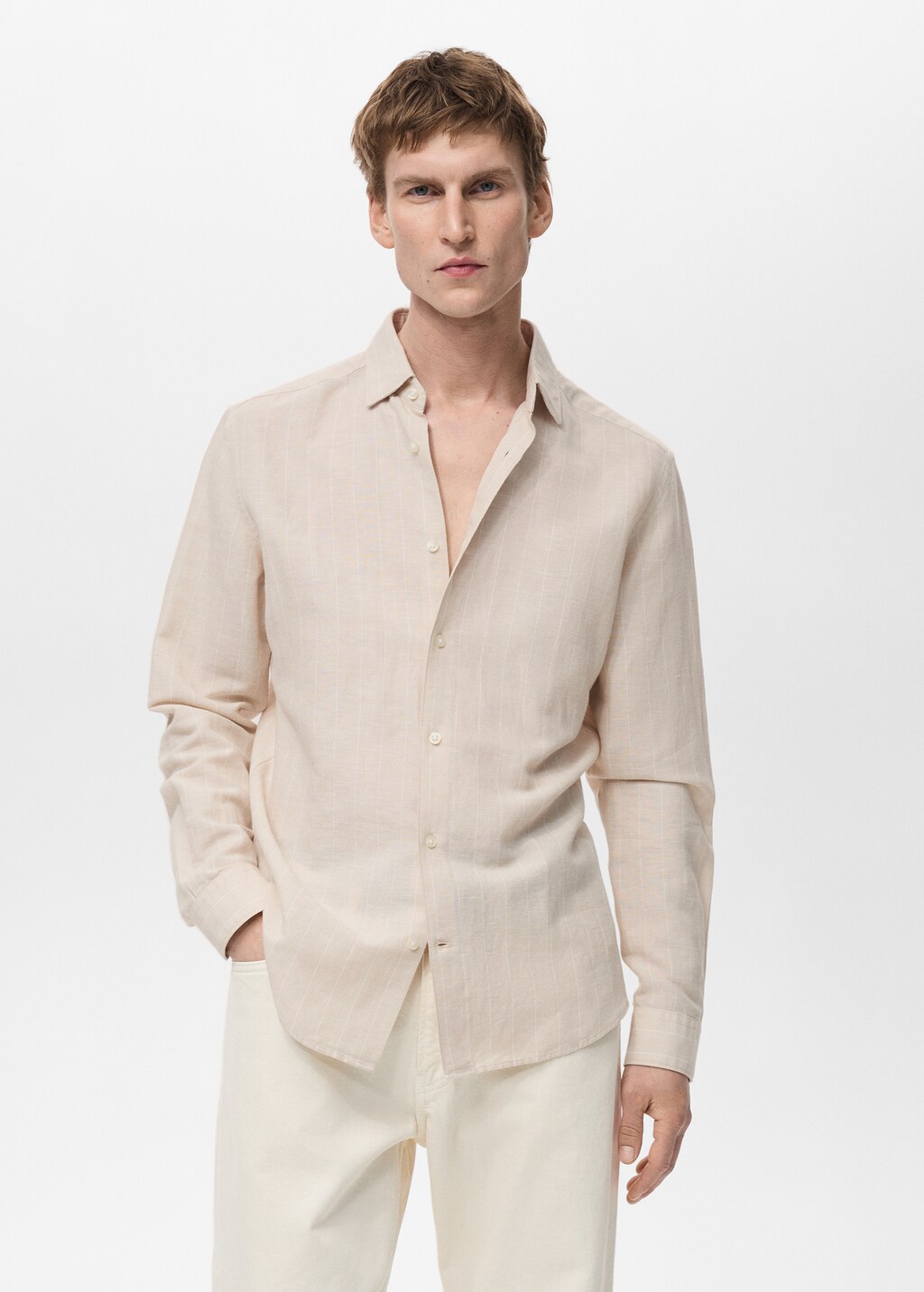 Coupe regular. Tissu lin mélangé. Col chemise. Fermeture avant avec boutons. Manches longues et poignets boutonnés. Pinces à l’arrière. Ourlet arrondi.