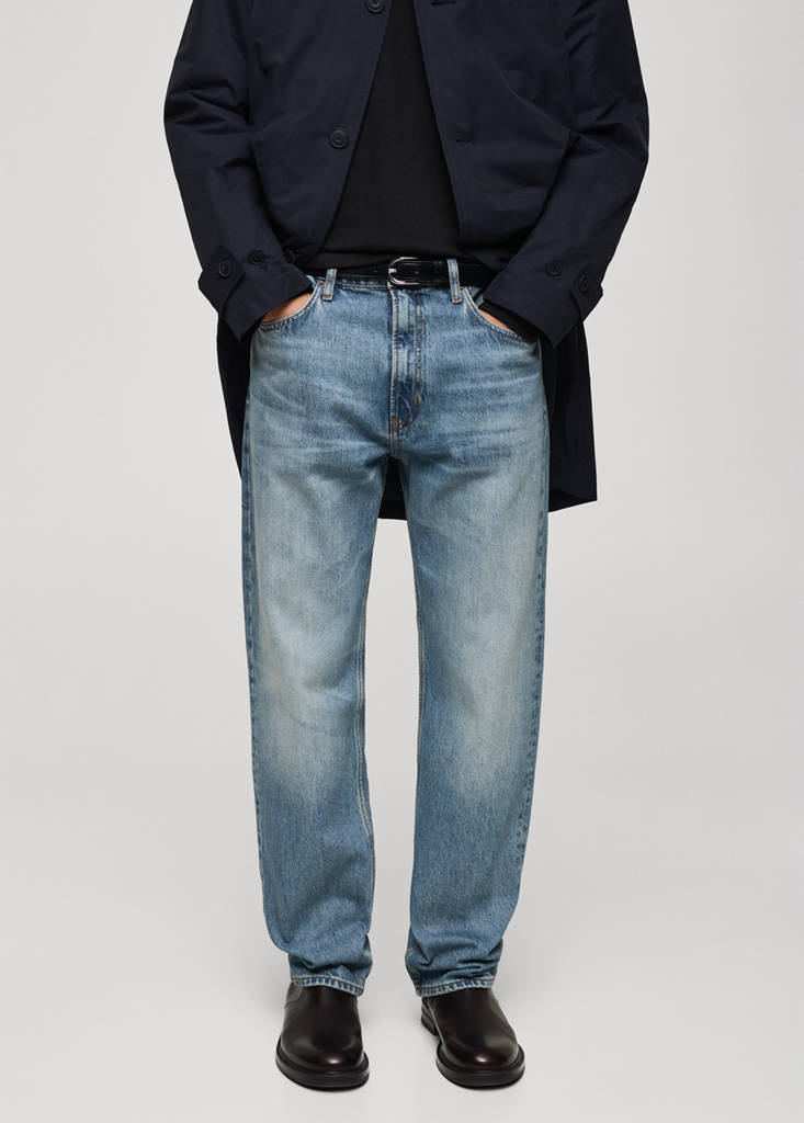 Straight-fit. Délavé clair. Taille mi-haute. Tissu 100% coton. Fermeture Éclair et bouton à l’avant. Passants de ceinture. Deux poches avant. Poche gousset au niveau des hanches à l’arrière. Deux poches plaquées à l'arrière