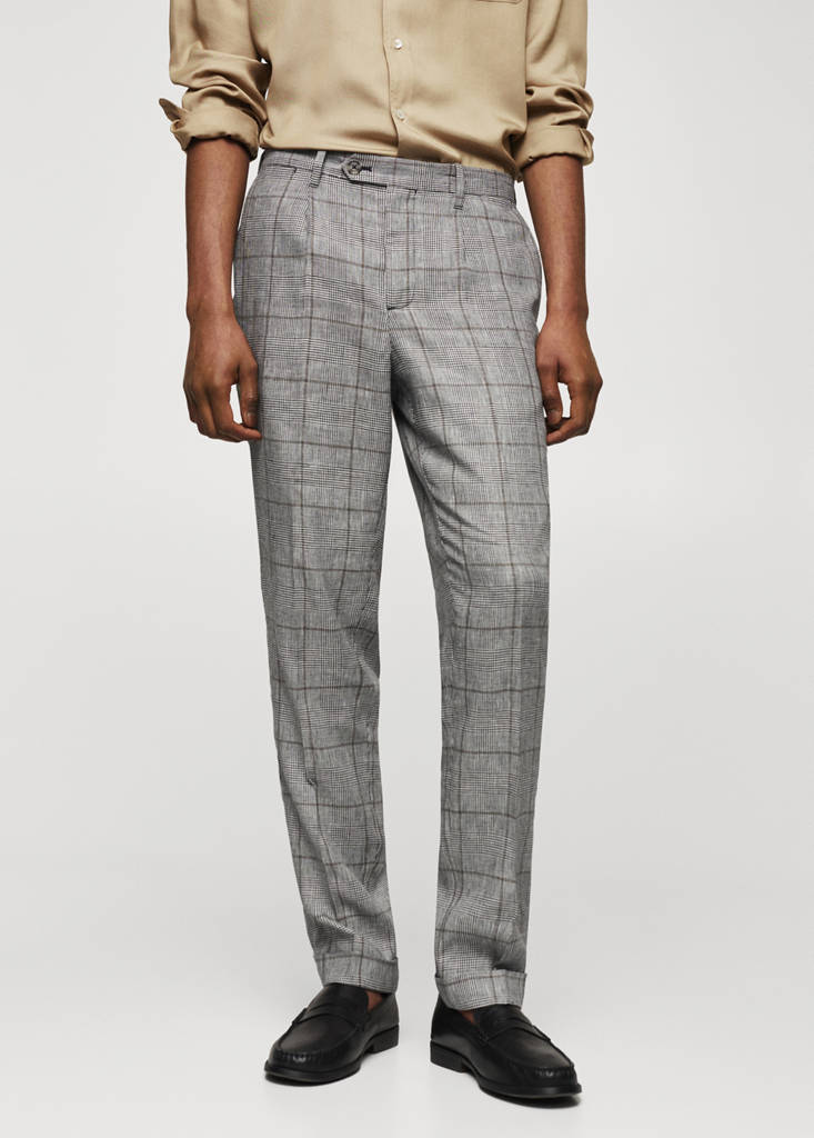 Slim fit. Tissu en lin mélangé. Tissu léger. Taille mi-haute. Imprimé à carreaux prince de galles. Double bouton et fermeture Éclair. Passants de ceinture. Pinces sur le devant. Deux poches avant. Deux poches passepoilées avec bouton à l'arrière. Pince à l'arrière. Revers