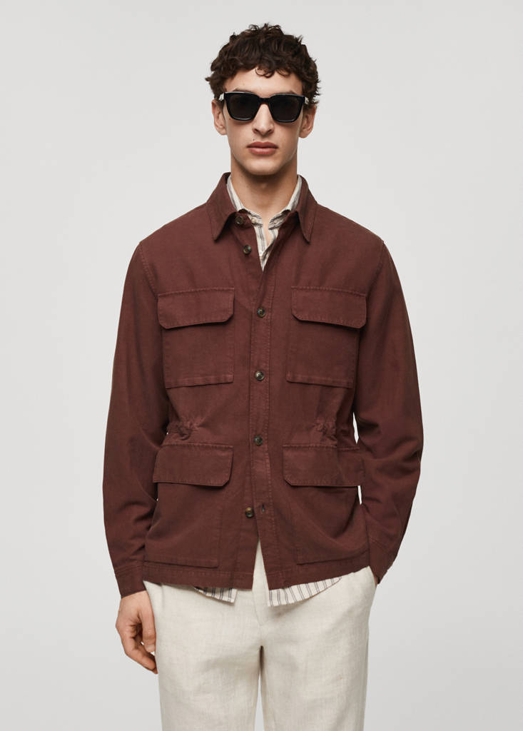 Tissu en lin mélangé. Quatre poches plaquées à l’avant. Manches longues et poignets boutonnés. Cordon de serrage à l'arrière. Poche intérieure avec fermeture à bouton. Ourlet droit. Col classique. Fermeture avant avec boutons