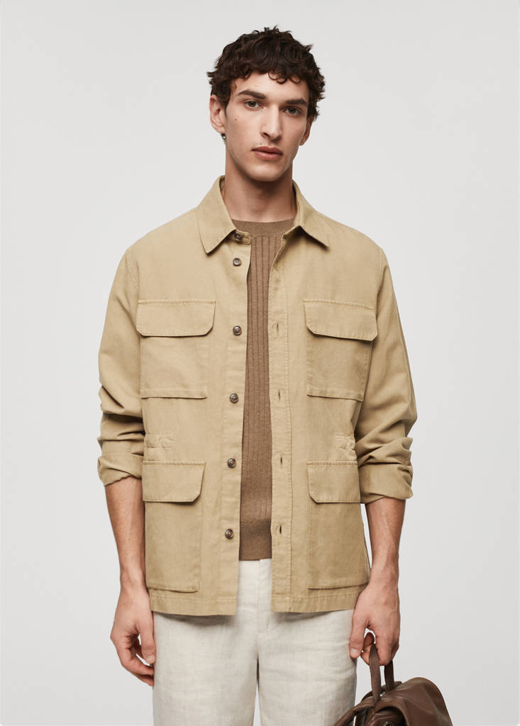 Tissu en lin mélangé. Quatre poches plaquées à l’avant. Manches longues et poignets boutonnés. Cordon de serrage à l'arrière. Poche intérieure avec fermeture à bouton. Ourlet droit. Col classique. Fermeture avant avec boutons