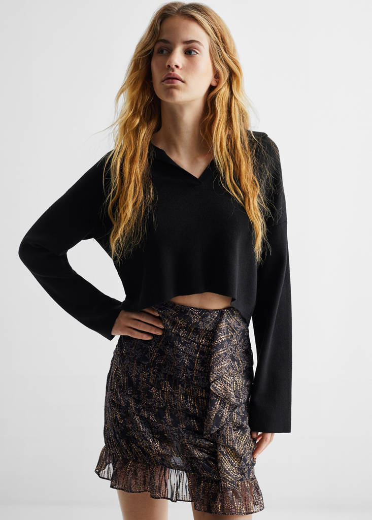 Imprimé. Droit. Coupe courte. Taille haute. Fermeture latérale. Base volantée. Le mannequin mesure 172 cm et porte une taille L