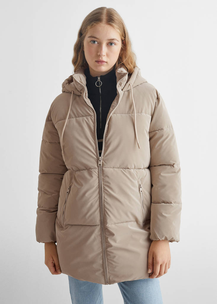 Tissu polyester, tissu effet brillant, matelassé, coupe longue, À capuche, fermeture Éclair.
