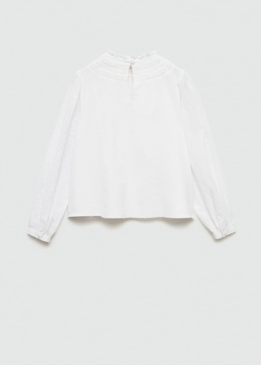 Straight design. Embroidered neck. Long sleeves. Button closure at the back. Embroidered design.