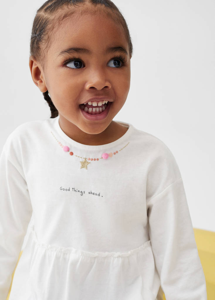 100% cotton fabric. Long sleeve. Rounded neck. Sling back. Decorative pompoms