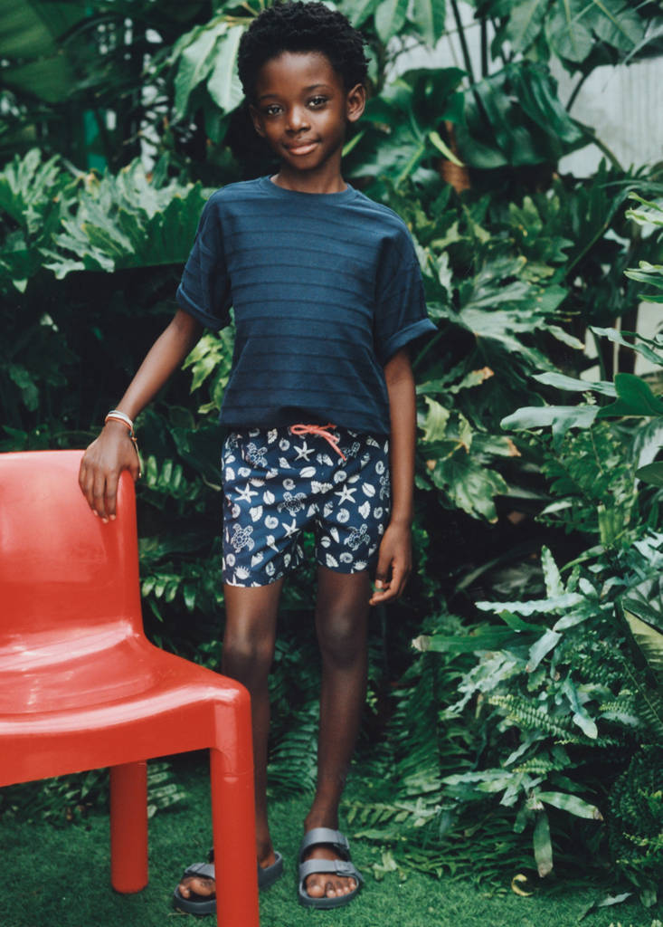 With inner lining. Short design. Marine print. Back patch pocket with Velcro. Elastic waist with drawstring