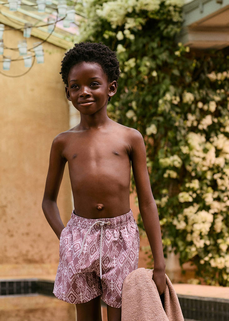 With inner lining. Short design. Straight design. Print. Patch pocket. Elastic waist with drawstring