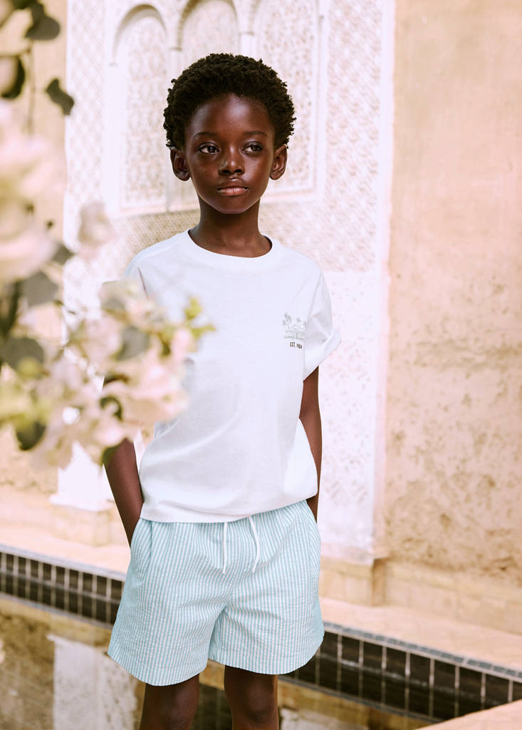 Cotton fabric. Seersucker fabric. Short design. Straight design. Striped design. Elastic waist with drawstring