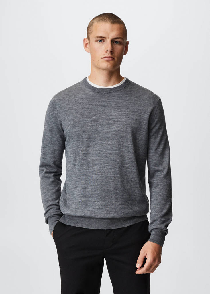 Basics Collection. 100% merino wool. Fine knit fabric. Machine washable. Round neck. Long sleeves. Ribbed finishes