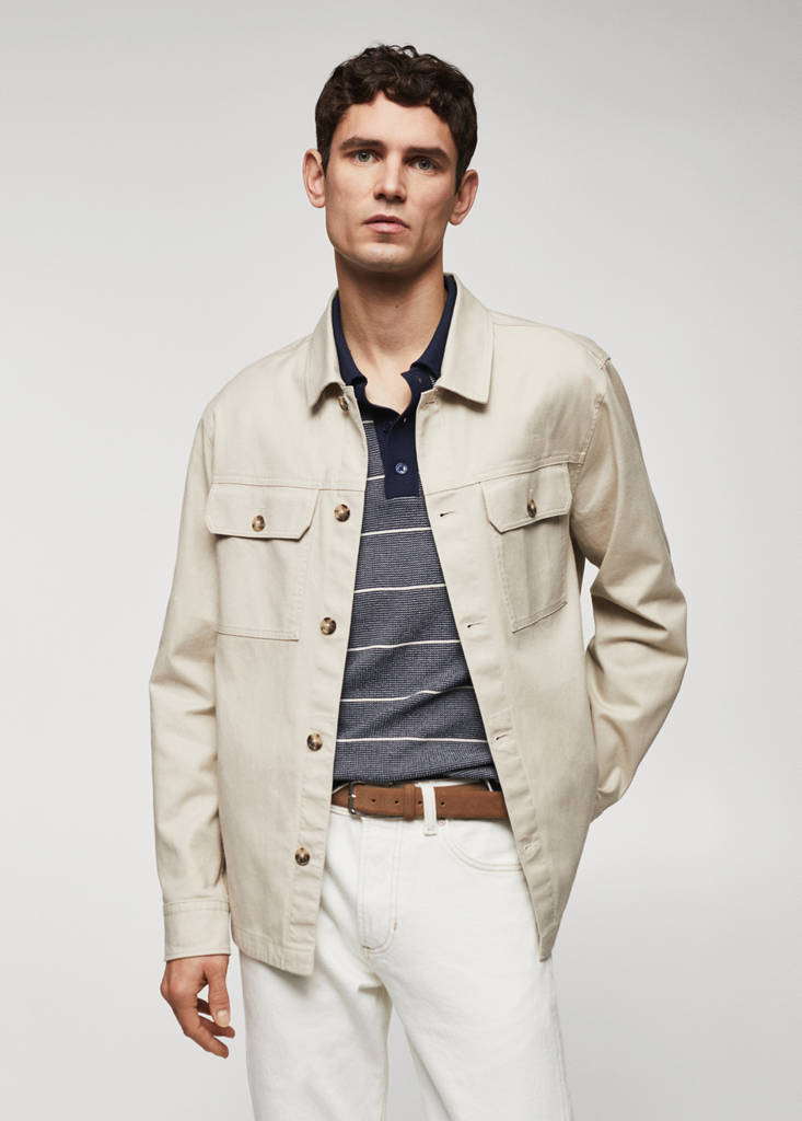 Slim fit. Cotton-blend fabric. Shirt-style collar. Two patch pockets with flaps on the chest. Button fastening on the front section. Long sleeve with buttoned cuffs. Without inner lining. Straight hem. The model is 185 cm tall and is wearing a size M