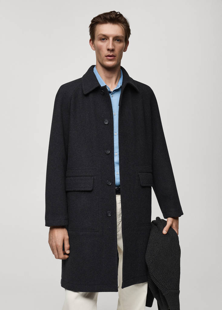 Wool mix fabric. Regular fit. Front button fastening with concealed placket. Long sleeves. Straight hem. Two patch pockets and front flap pockets. Partial inner lining. Classic collar