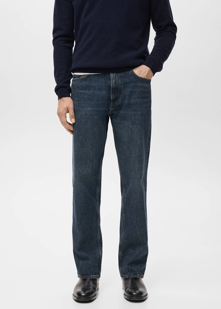 Straight-fit. 100% cotton fabric. Dark wash. Two front pockets. Hip-level coin pocket on the back. Two patch pockets at the back. Belt loops. Front zipper and button closure