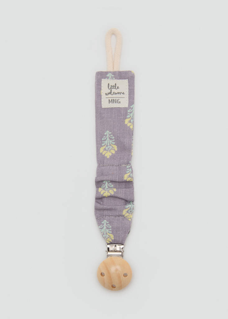The pacifier clip is crafted from 100% cotton fabric, featuring a wooden brooch that complements its floral design. It includes a metal clip fastening to ensure both functionality and style