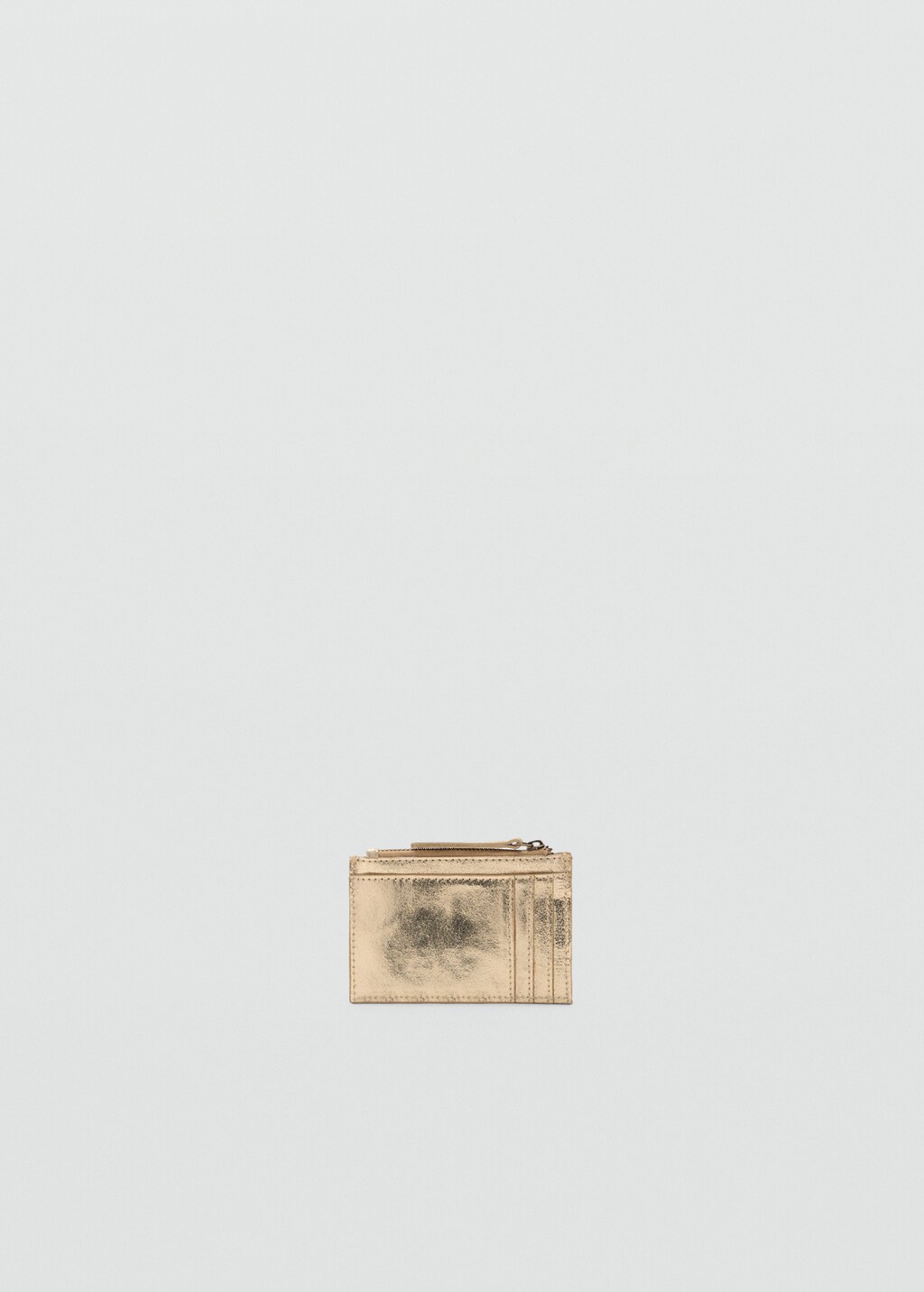 100% bovine leather. Metallic. Card holder wallet. Coin pocket. Zip closure.