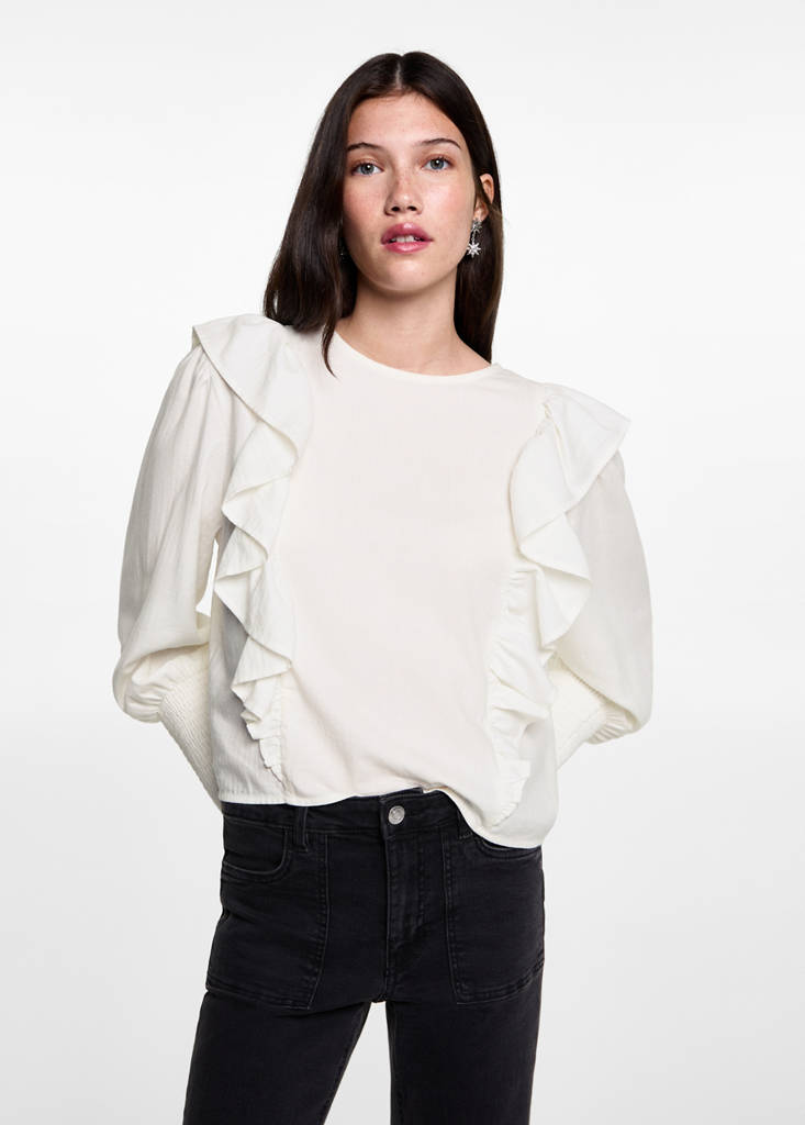 Back to class. 100% Cotton. Straight design. Round neck. Ruffle detail. Long sleeves with ribbed trims. Button closure at the back