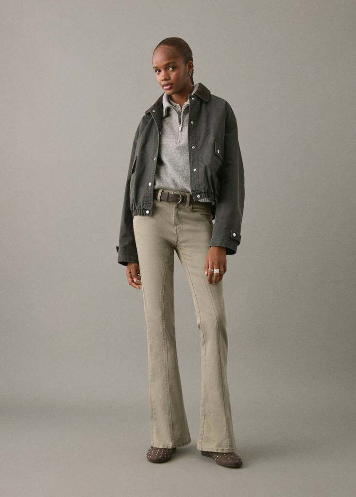 Cotton fabric. Stretch fabric. Long design. Flare design. Regular Waist. Belt loops. Button and zip fastening. Coin pocket. Two side pockets. Two patch pockets at the back. Decorative seams
