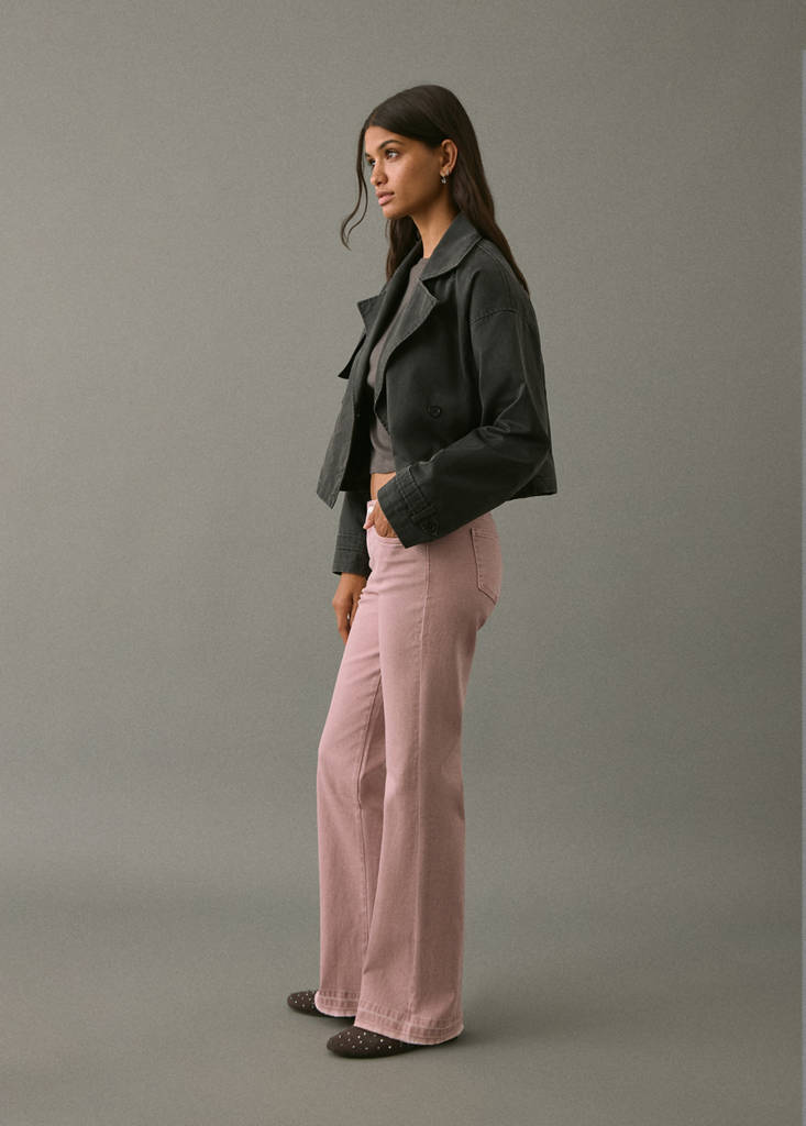 Cotton fabric. Stretch fabric. Long design. Flare design. Regular Waist. Belt loops. Button and zip fastening. Coin pocket. Two side pockets. Two patch pockets at the back. Decorative seams