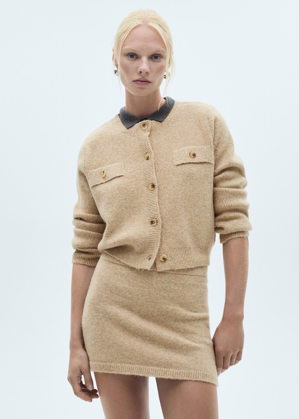 Wool mix fabric. Cable knit. Midpoint. Short Design. Straight Design. Round neck. Long sleeve. Button fastening at the front. Twin buttoned flap pockets at front. Total look.