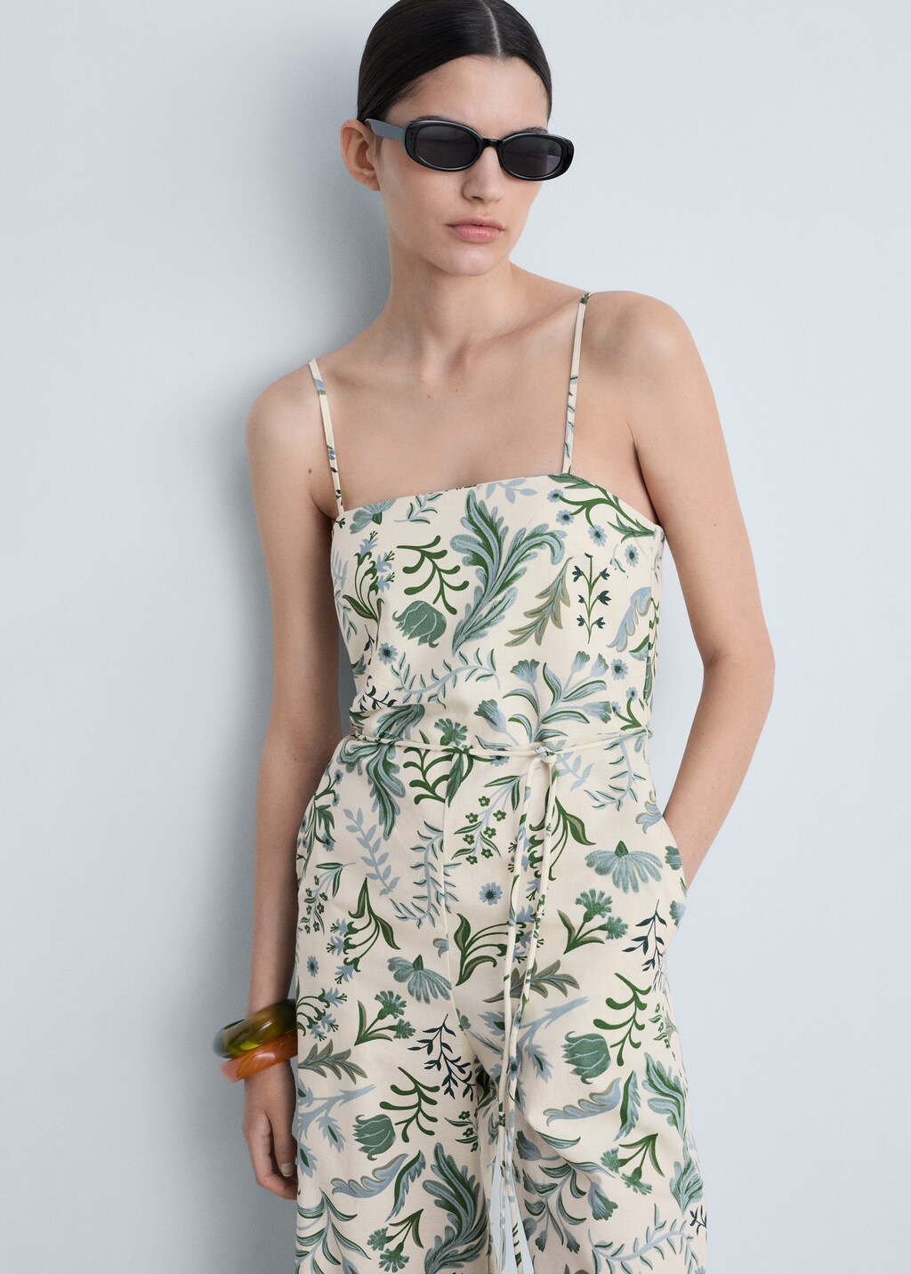 Cotton and linen blend fabric. Straight design. Long design. Print Flowers. Square neckline. Sleeveless. Thin straps. Decorative drawstring. Invisible lateral zip fastening.