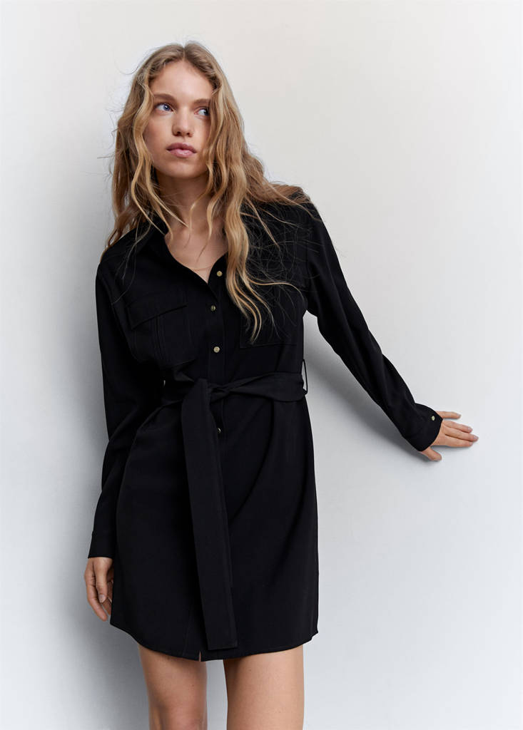Flowy fabric. Straight design. Short design. Shirt-style collar. Two front pockets. Long sleeve. Front button closure. Decorative bow. Loops. Party and events collection