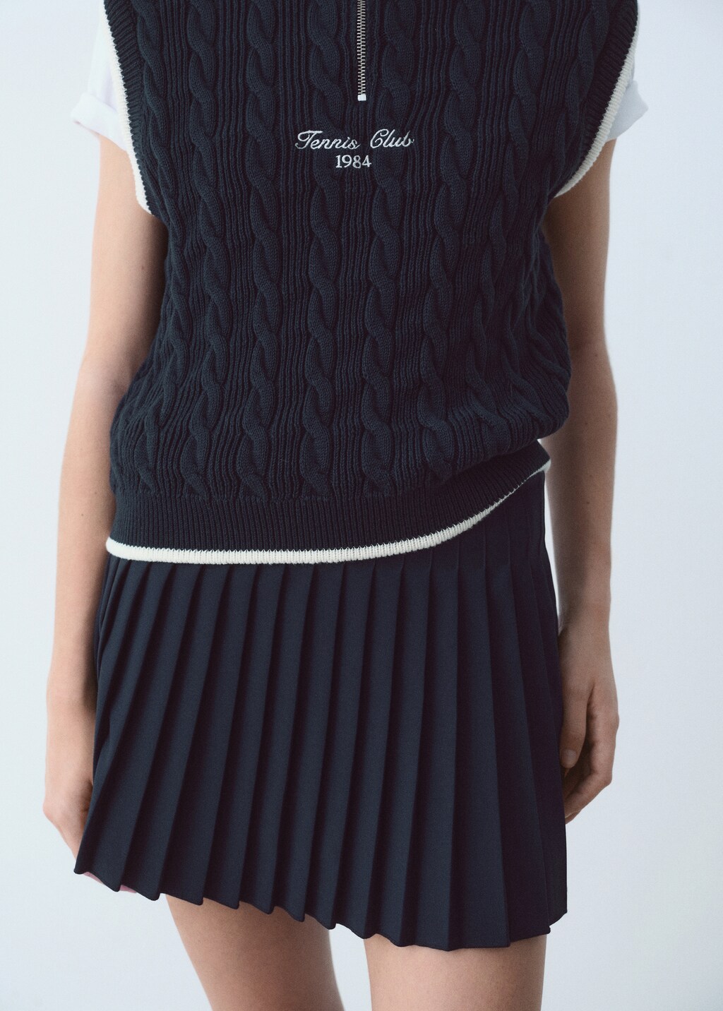 Fine-knit fabric. Braided knit. Straight design. Embroidered message. High collar. Sleeveless. Size: 28.5x8x2 cm. Contrast trims. Godo Collection.