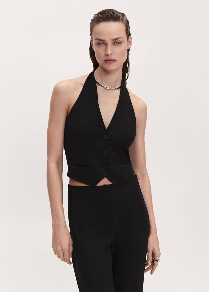 Selection Collection. Flowy fabric. Narrow design. Cropped design. Fitted design. Open back. V-neck. Wide straps. Inner lining. Front button closure. Co-ord. Party and events collection