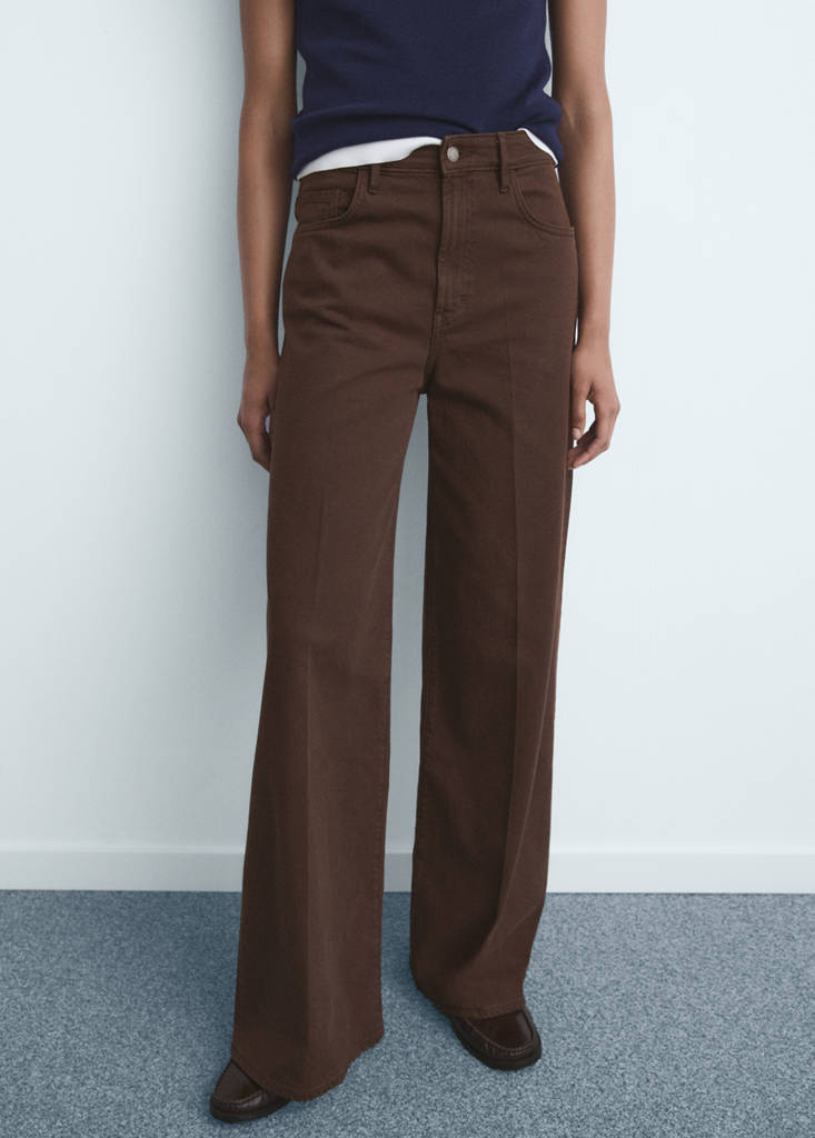 Denim-style cotton fabric. Long design. Wide-leg design. High waist. Belt loops. Five pockets. Button and zip fastening. Inseam 83 cm. Comfort fabric with elasticity