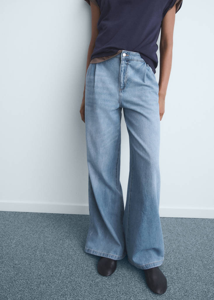 Denim-style cotton fabric. Long design. Wide-leg design. Mid-rise. Belt loops. Front pleat detail. Jeans with tie closure. Button and zip fastening. Inside length 81 cm. Available Plus