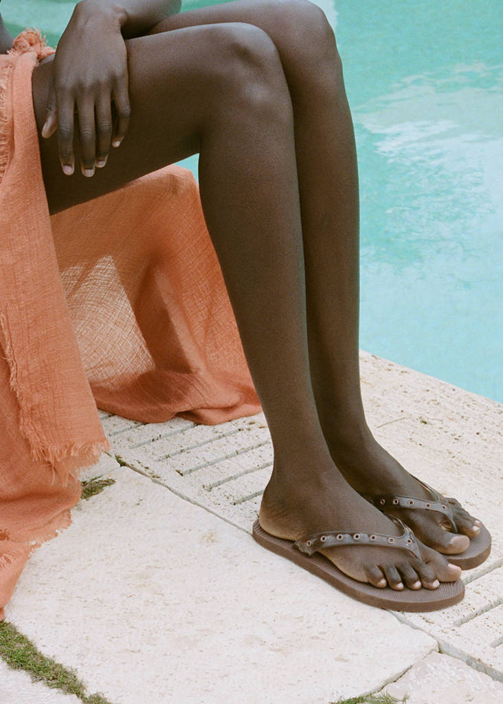 Straps design. Slingback design. Vinyl strips. Eyelets detail. No Fastening