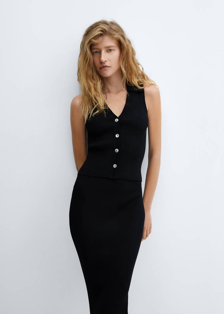 Buttoned knit topPrice historyInitial price struck through [€ 35.99 ]€ 35.99Current price [€ 23.99 ]€ 23.99-33%Select a colourBlackThe model is wearing size S and is 177cm tall.Select your sizeXSNot available. I want it!SNot available. I want it!MNot available. I want it!LNot available. I want it!XLNot available. I want it!Notify meFine knit fabric. Cable knit. Shirt-style V-neck collar. Sleeveless. Front closure with buttons. Fitted designDetails, composition and careStore availability