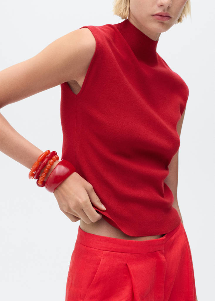 Crafted from fine-knit fabric, this straight design features an elegant perkins collar and sleeveless style, offering comfort and versatility