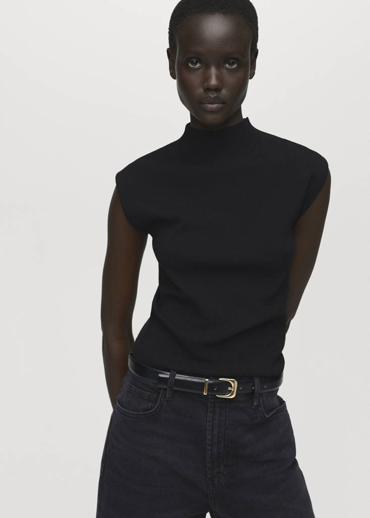 Crafted from fine-knit fabric, this straight design features an elegant perkins collar and sleeveless style, offering comfort and versatility
