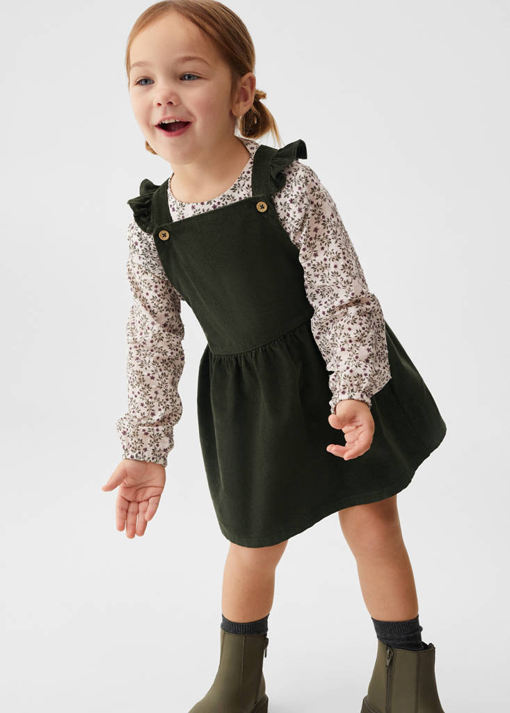 Corduroy fabric. Short design. Crossover straps. Ruffled straps. Elasticated waistband. Button up