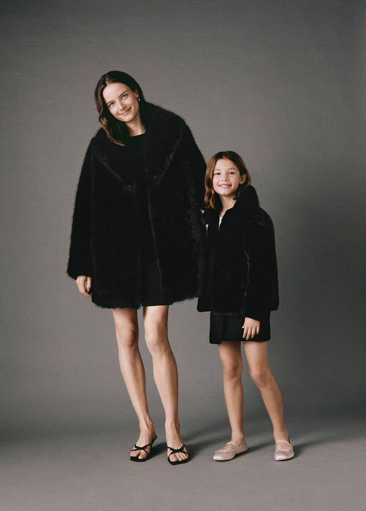 Party, ceremony and communion collection. Christmas Collection. Faux fur fabric. Straight design. Short design. Shirt collar. Long sleeves. Front closure. Front closure with buttons
