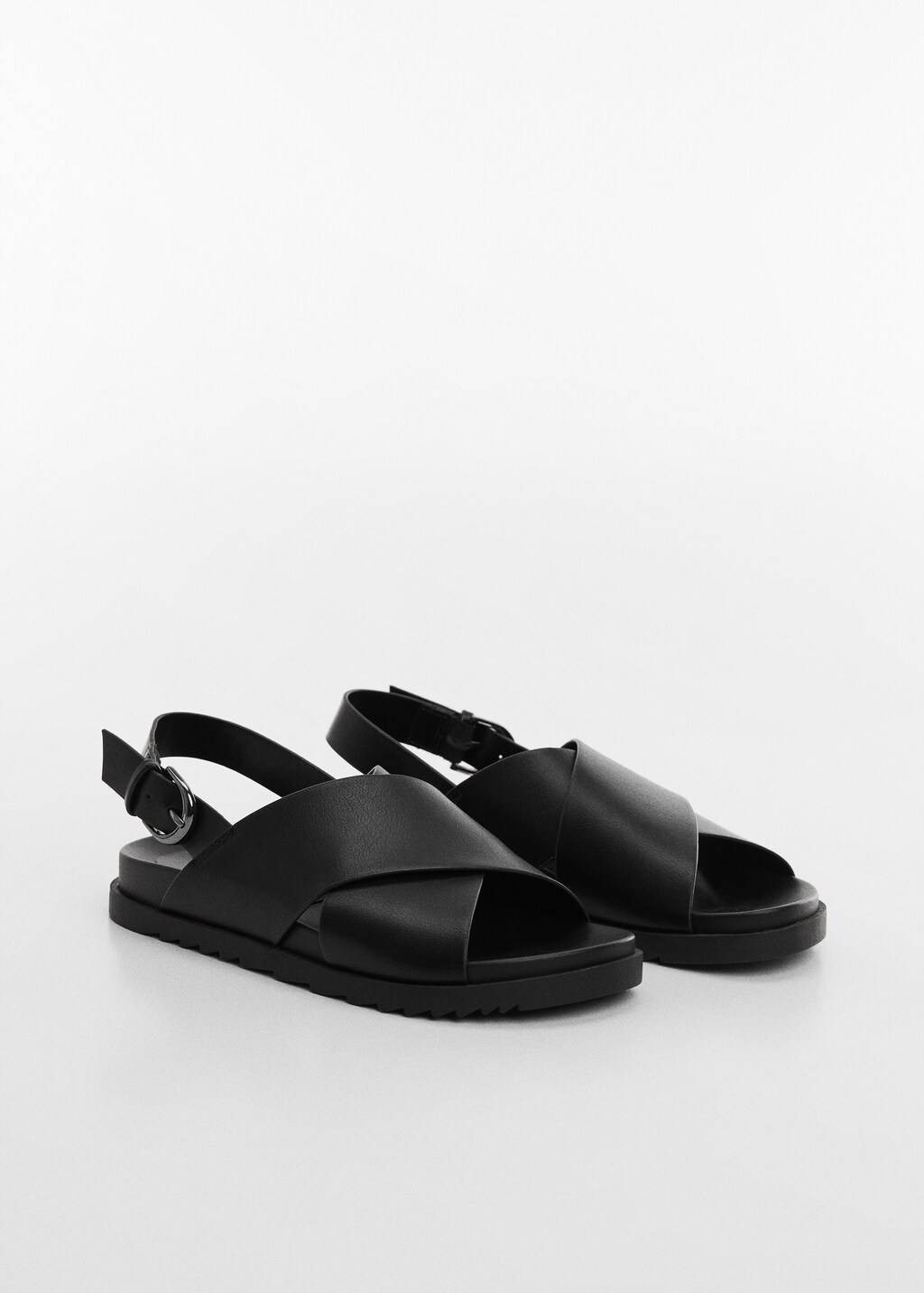 Wrap design. Straps design. Round toe. Front opening. Flat. Buckle closure.