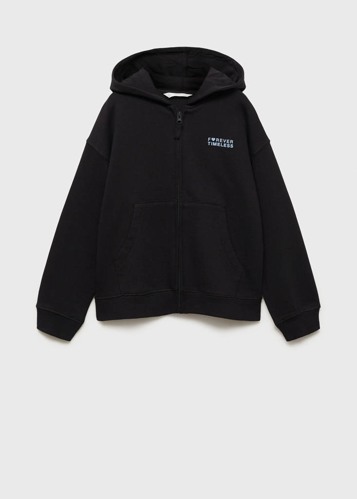 Long sleeves. Printed design. V-neck. Hood. Two side pockets. Zip closure. 100% Cotton. Straight design