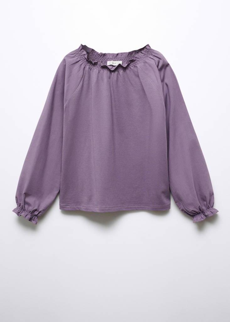 Straight design. Gathered detail. Ruched detail on the cuffs. Ruched neck. Long sleeves. No Fastening
