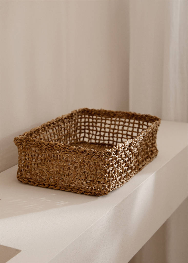 Medium. 100% totora. Rectangular design. To store and organise books, clothes, toys and other household items, keeping your home tidy in an elegant, rustic way that complements your home decor. This model of basket is available in 3 sizes (S,M,L). Size: 25x35cm. Height: 10.5cm