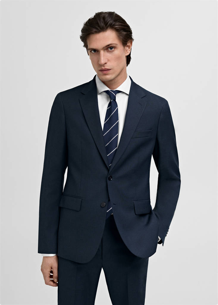 Slim fit. Notched lapel collar. Front closure with buttons. Long sleeves with buttoned cuffs. Chest welt pocket. Two front welt and flap pockets. Double back vent at the hem. Inner lining. Interior pocket