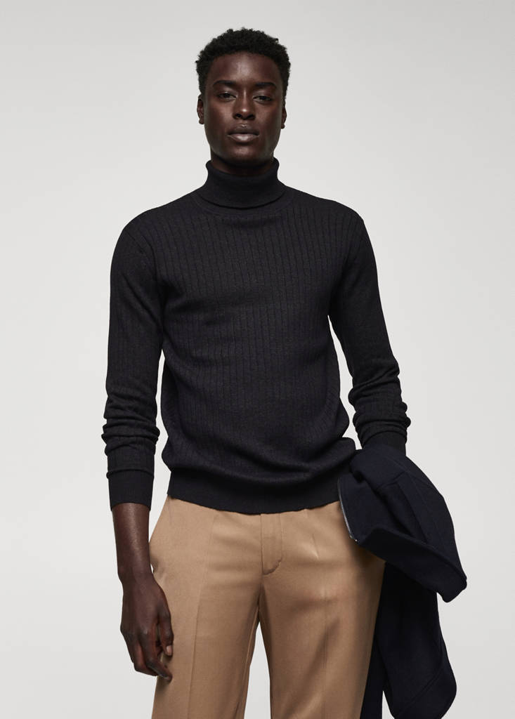 Cotton and polyester blend fabric. Fine-knit cotton fabric. Regular fit. Ribbed design. High neck. Long sleeves. Long sleeves with elastic cuffs. Straight hem. The medium brown colour is an online exclusive. Untrimmed hem