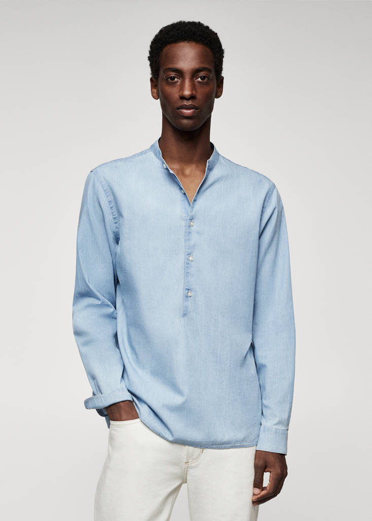 100% Cotton. Light fabric. Regular fit. Mao neckline. Button fastening on the front section. Long sleeve with buttoned cuffs. Hem with side slits