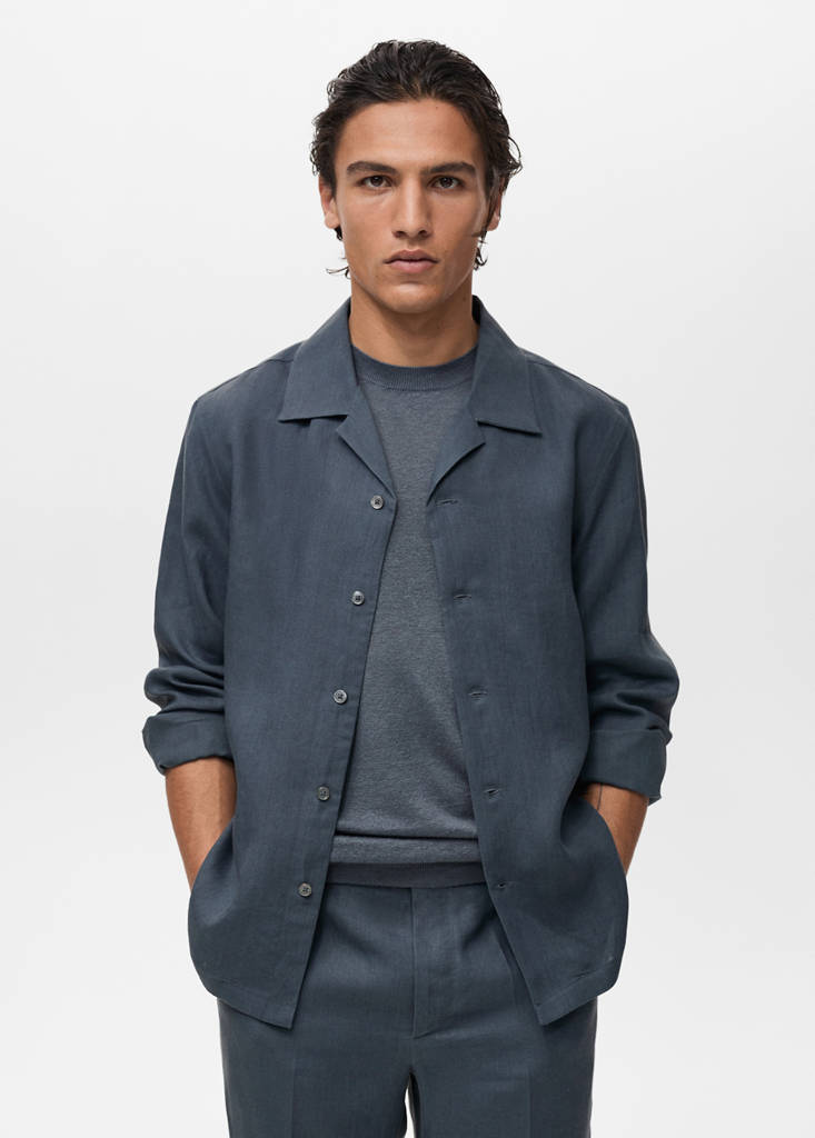 Selection Collection. 100% linen fabric. Regular fit. Bowling collar. Front closure with buttons. Dart detail on the cuffs. Buttoned cuffs. Small side slits on the hem. Straight hem