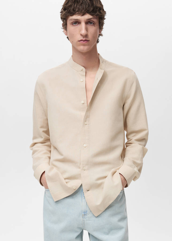 Cotton blend fabric. Mao neckline. Button fastening at the front. Long sleeves with buttoned cuffs. Detail of rear calipers. Rounded base. Classic fit. The khaki and green models are online exclusives. Linen and cotton blend fabric. Front closure with buttons. Buttoned cuffs