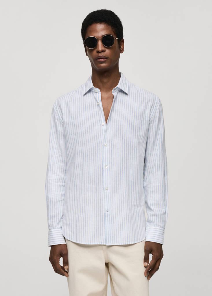 The blue and beige striped shirt is an Online Exclusive. Regular fit. Cotton and linen blend fabric. Shirt collar. Vertical striped print. Long sleeves with buttoned cuffs. Rounded base. Front closure with buttons