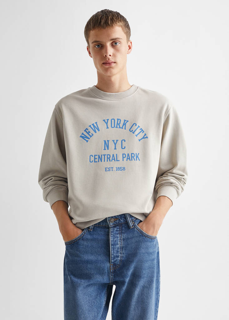 Denim style cotton fabric. Tapered fit: wide cut at the top that narrows from the knee to the ankle. Washed-effect colour. Straight design. Five pockets. Medium waist. Medium. Button up. The model is 182cm tall and is wearing a size L