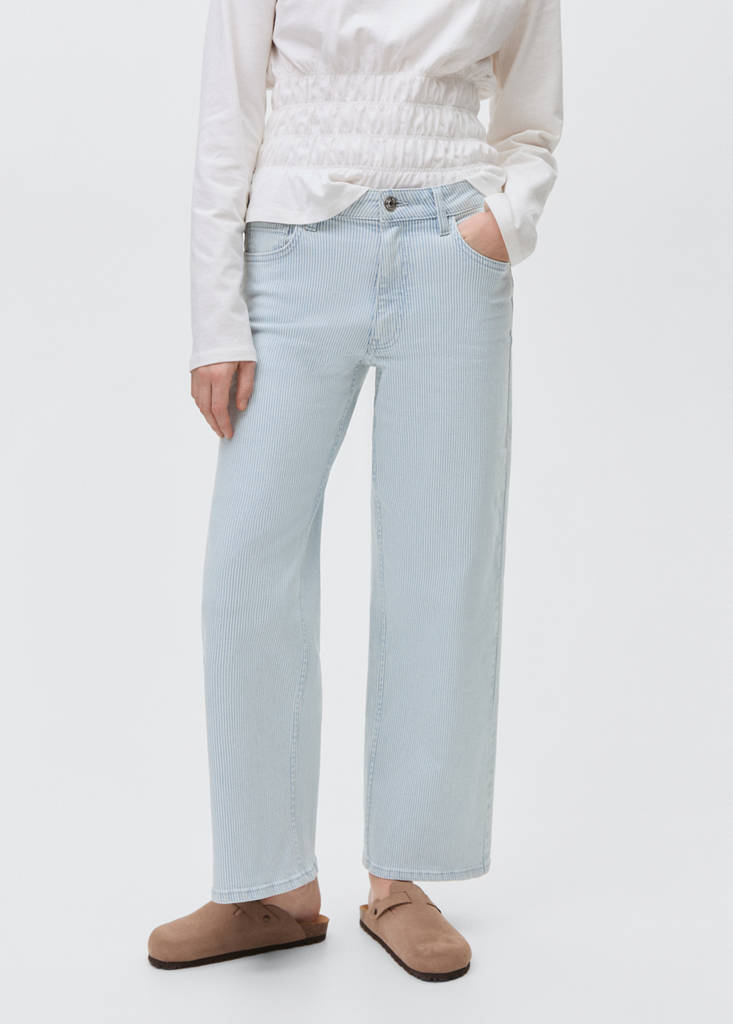 Denim-style cotton fabric. Stretch fabric. Culotte design. Crop design. Low waist. Five pockets. Belt loops. Zip and button fastening