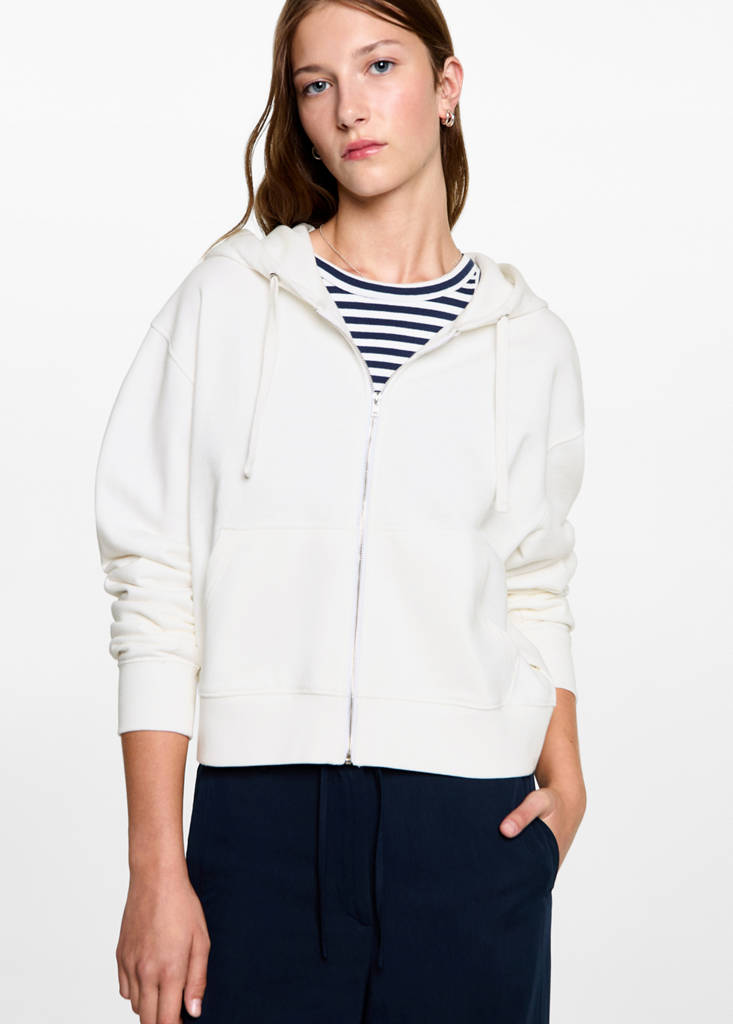 Straight design. Crop design. Hood with drawstring. Two front pockets. Long sleeves. Zip fastening