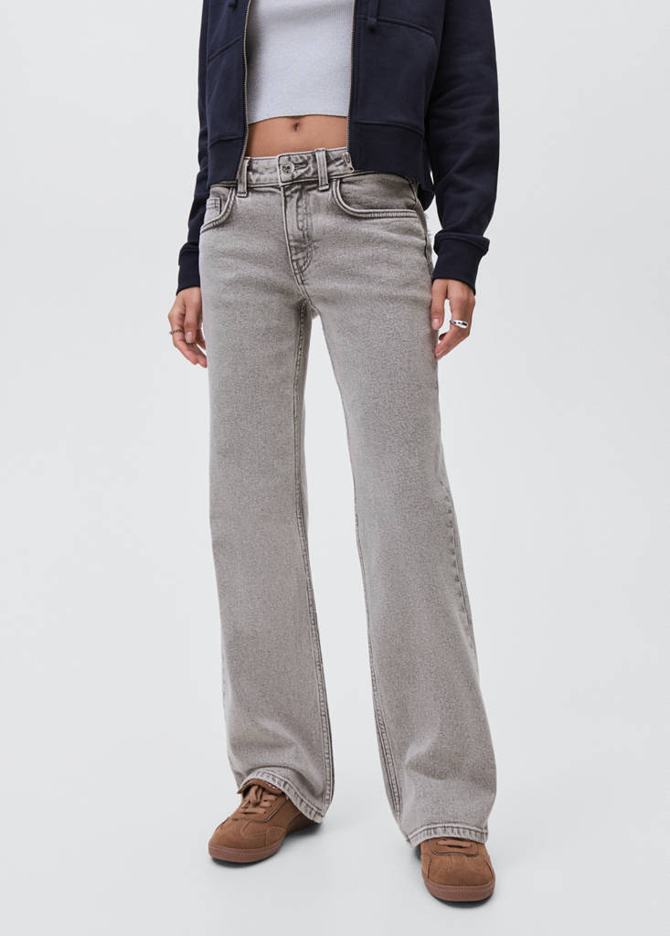 Cotton fabric. Stretch fabric. Straight design. Low Waist Rise. Straight-fit. Belt loops. Two side pockets. Embroidered butterflies