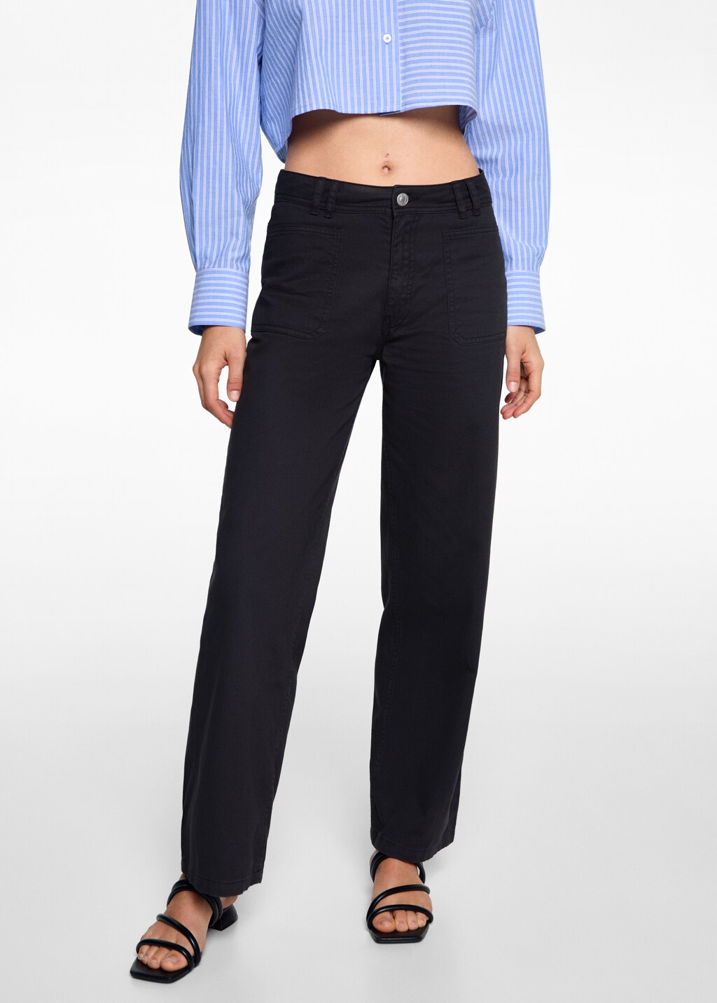 Straight Design. Standard design. 100% Cotton. Long design. Two side pockets. Mid-rise. Zip and button fastening.